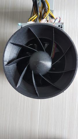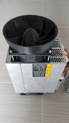 This is a 3d printed fan shroud that we designed and printed in-house. It is made from durable ABS plastic, and allows you to connect a 150mm flexible duct to your miner's 120mm exhaust fan, allowing you to vent the hot air directly outside (or in winter, into your air conditioning ducts). For longer runs, I have found that a 150mm duct is the minimum required to allow airflow from the machine, anything smaller increases the backpressure, which leads to higher temperatures.