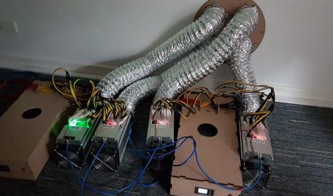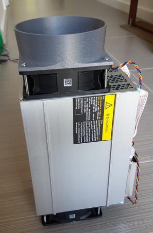 This is a 3d printed fan shroud designed and 3d printed in-house. It is made from durable ABS plastic, and allows you to connect a 125mm flexible duct to your miner's 120mm exhaust fan, allowing you to vent the hot air directly outside (or in winter, into your air conditioning ducts). I have found that a 125mm duct is the minimum required to allow airflow from the machine, anything smaller increases the backpressure, which leads to higher temperatures.